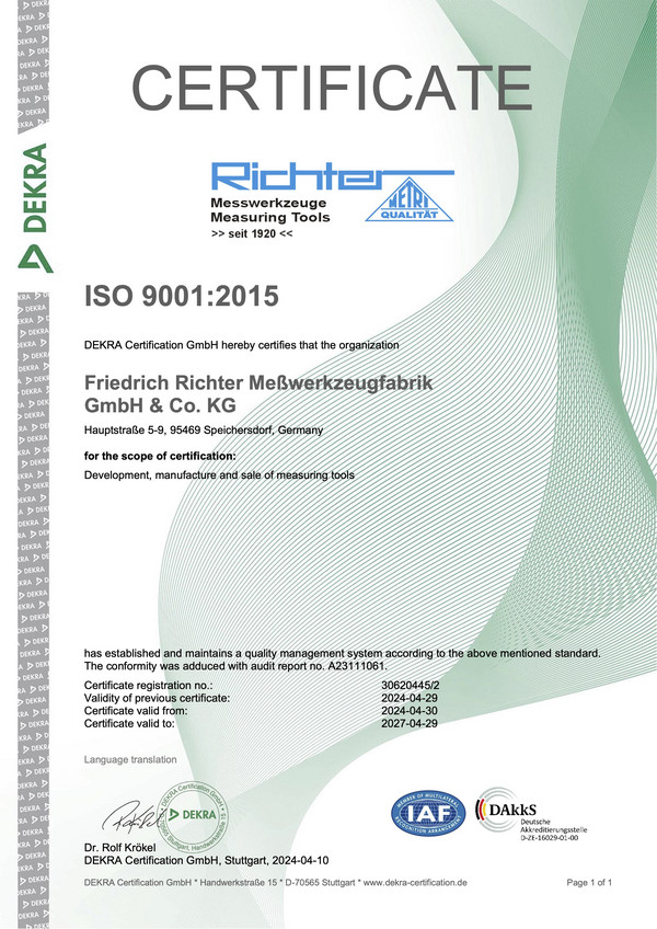 It is official: The quality management of Friedrich Richter Messwerkzeugfabrik GmbH & Co. KG meets the standard of DIN EN ISO 9001:2015. This means that with us, you can rely on uniform processes and high quality work. We always orientate on the expectations of our customers and optimize our processes through regular audits.