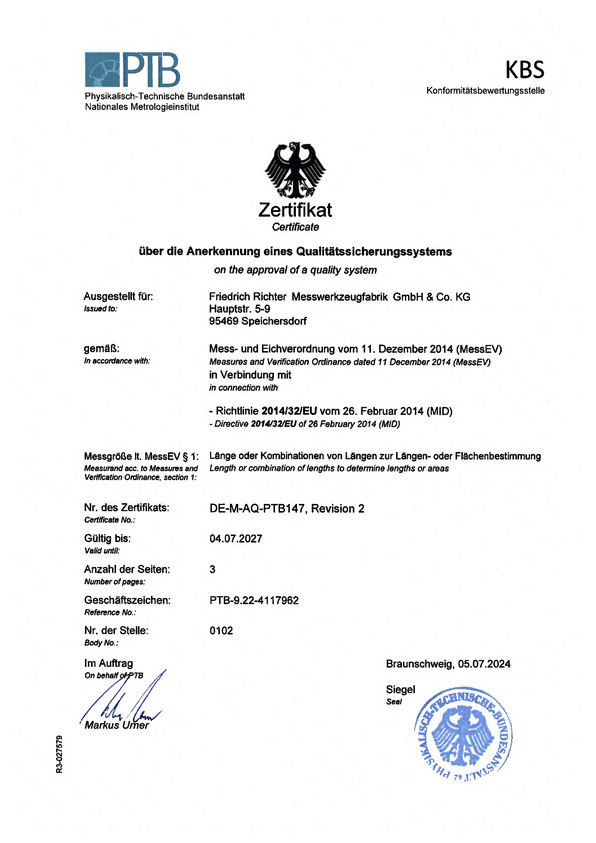We are proud of it: Friedrich Richter Messwerkzeugfabrik GmbH & Co. KG is certified for the approval of the European Measuring Instruments Directive (MID) 2014/32/EU, according to Module D. That means, we can deliver within short time, since we are now producing calibrated measuring tapes and folding rules with CE-marking, we can verify them and measure via laser measurement system.